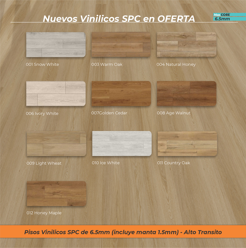 Max COREVinílico Rígido (SPC Click) Línea: OFERTAEspesor: 6.5mm (5+1.5mm Manto)Manto: 1.5mm manto EVA IncorporadoAncho: 18.2cmLargo: 1.22mts.Capa de Uso: A...